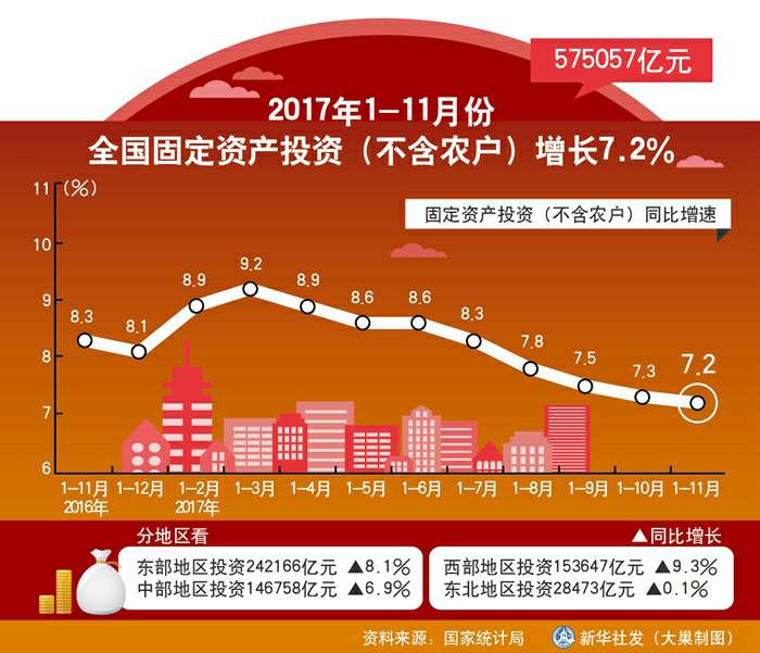 图表:2017年1-11月份全国固定资产投资(不含农户)增长7.2% 新华社发 大巢制图